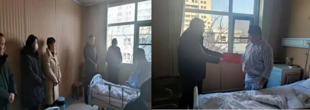 1月23日,中心领导刘相国、杨健、王宇、汪永、侯乐静、孙晋生到市立医院探望因罹患高级别脑胶质瘤正在治疗的杨列刚同志,并送上爱心捐款。
