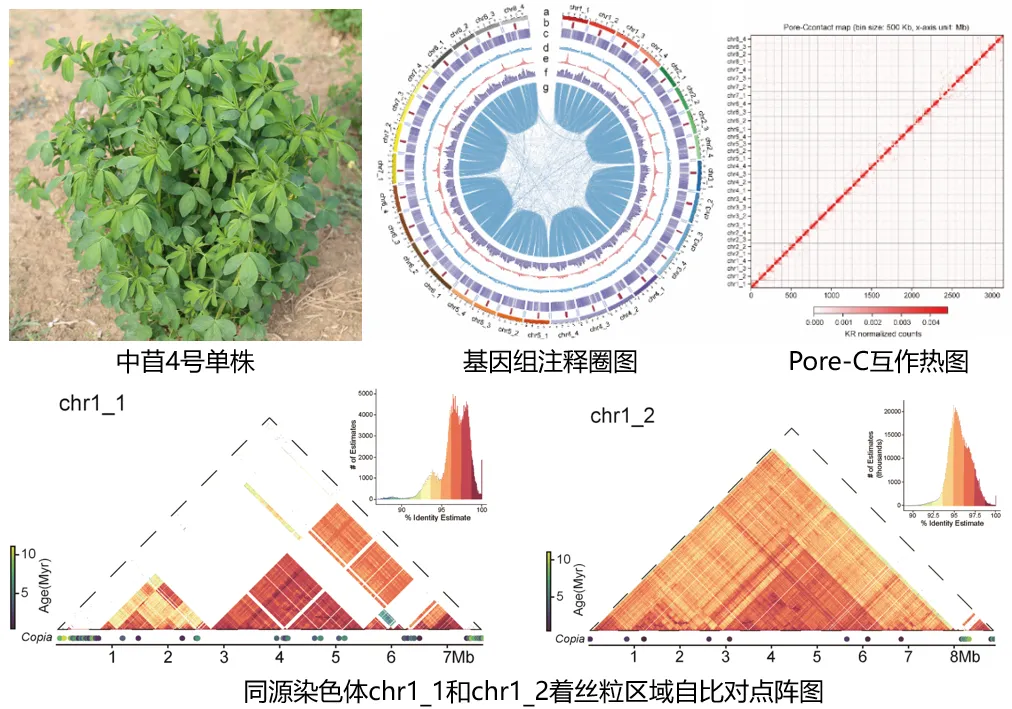 紫花苜蓿是全球最重要的豆科牧草之一,蛋白质含量高,适口性好,被誉为“牧草之王”,是奶牛等反刍动物的重要优质饲料。紫花苜蓿为同源四倍体植物,基因组结构较复杂,目前已公布的基因组对端粒、着丝粒等高重复序列区域的解析精度较低,组装完整度不高,严重制约了功能基因挖掘和分子育种研究进程。