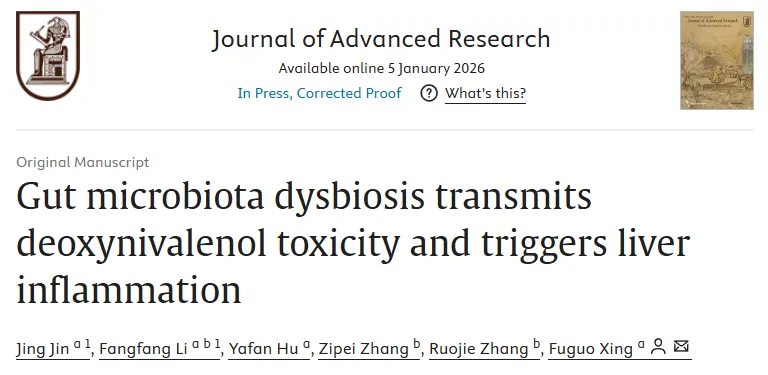 近日,中国农业科学院农产品加工研究所粮油减损与真菌毒素防控创新团队解析了肠道菌群失调在呕吐毒素(DON)诱发肝脏毒性中的核心机制,相关研究成果发表在国际期刊《前沿研究杂志(Journal of Advanced Research)》(JCR一区,IF:13)上。加工所靳婧副研究员与2022级硕士研究生李放放为论文共同第一作者,邢福国研究员为通讯作者。