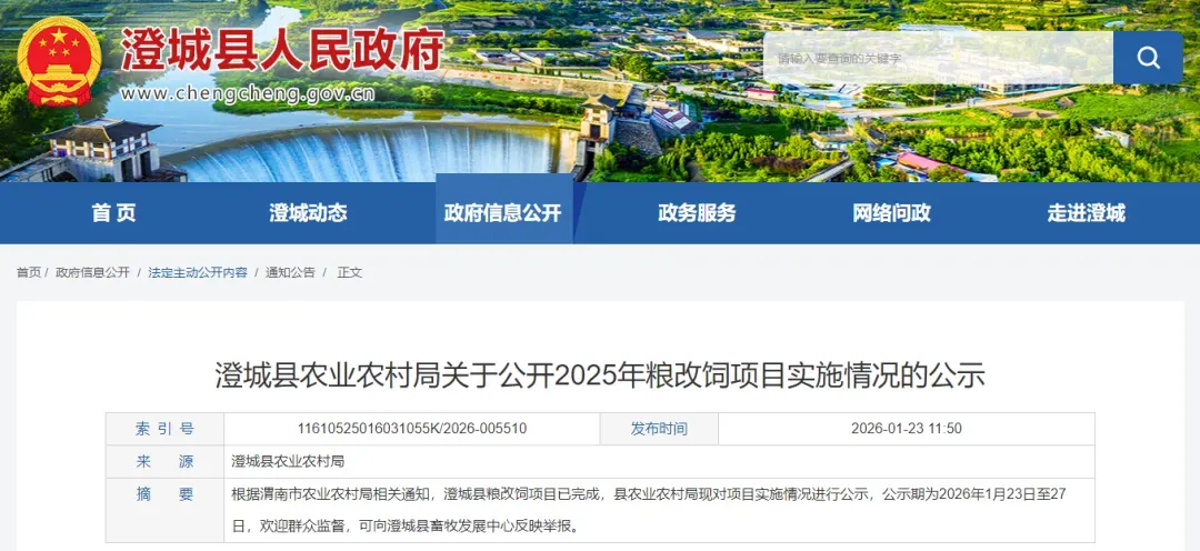 根据渭南市农业农村局《关于印发2025年农业产业发展资金实施方案的通知》(渭农计财〔2025〕123号)文件,粮改饲项目已顺利实施完成,现将项目实施情况进行公示。公示期5天,2026年1月23日至2026年1月27日。公示期间欢迎广大群众监督,如有需要反映的事项,请向澄城县畜牧发展中心来电来函反映和举报。