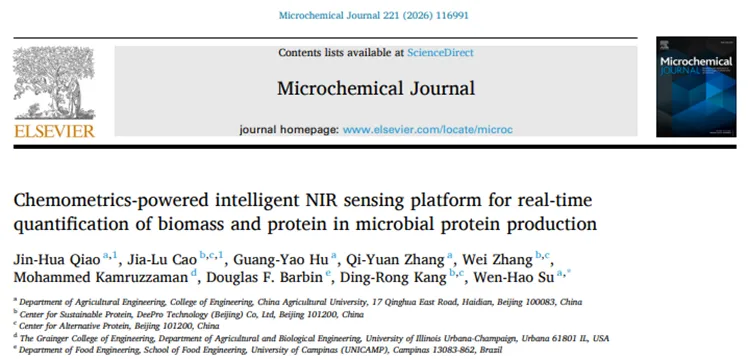 近日,中国农业大学工学院彭彦昆团队苏文浩研究员课题组在智能发酵领域取得重要进展。团队成功为发酵罐装上“火眼金睛”,实现了对微生物发酵全过程的实时深度洞察。相关成果发表于分析化学领域国际权威期刊《Microchemical Journal》(创刊于1957年)。该研究开发了一套由化学计量学赋能的智能近红外(NIR)传感平台,首次实现了马克斯克鲁维酵母(Kluyveromyces marxianus)高密度发酵过程中生物量与蛋白质含量的实时、原位、非破坏性定量监测。这一创新方案为微生物蛋白生产的过程控制与智慧化管理提供了强有力的技术支撑。