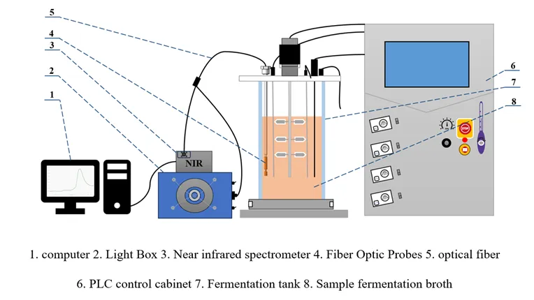 该研究针对马克斯克鲁维酵母发酵过程中生物量与蛋白质含量难以实时定量监控的瓶颈,成功构建了一套软硬件深度集成的智能化近红外监测系统。该系统通过浸入式光纤探头实现原位光谱采集,并深度融合了高稳定性光谱特征提取算法与先进的非线性学习模型,为微生物蛋白的智慧化生产提供了全流程、自动化、非破坏性的解决方案 。