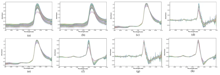 (a)Raw spectral image; (b–h) Spectral images after preprocessing with SG, SNV, 1st, SG+SNV, SG+1st, SNV+1st, and SG+1st+SNV, respectively.