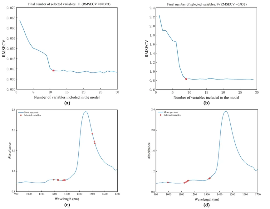 (a) Relationship between the number of selected feature wavelengths and RMSECV for protein content; (b) Relationship between the number of selected feature wavelengths and RMSECV for biomass content.(c)Feature Wavelength Distribution of protein Content, (d) Feature Wavelength Distribution of biomass Content