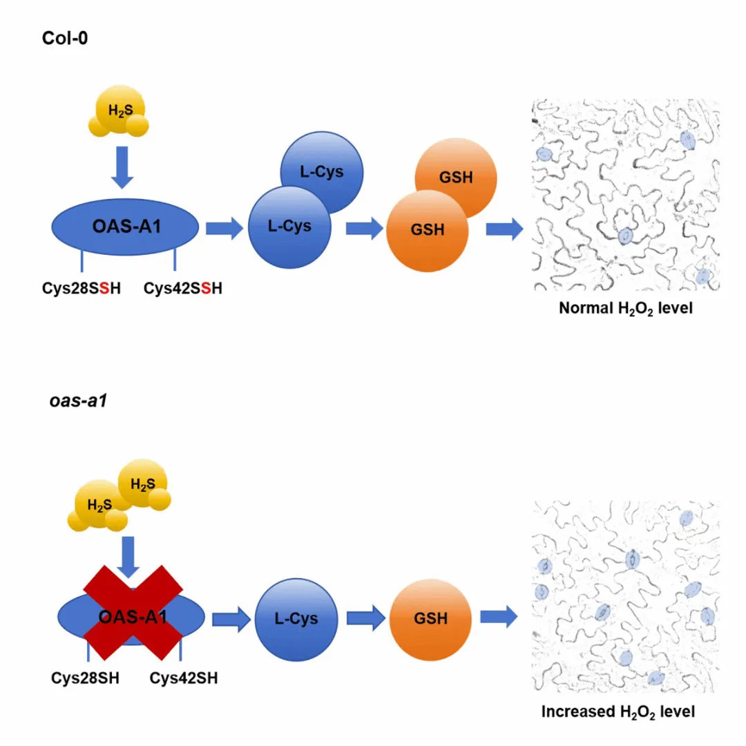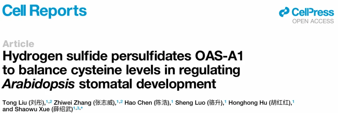 气孔是植物与外界环境进行农业大学生命科学技术学院与湖北洪山实验室薛绍武教授课题组在国际权威期刊《Cell Reports》上发表了一项突破性研究成果,题为“Hydrogen sulfide persulfidates OAS-A1 to balance cysteine levels in regulating Arabidopsis stomatal development”。该研究首次揭示了H₂S通过巯基化修饰OAS-A1蛋白,从而促进Cys的合成,维持GSH与过氧化氢(H₂O₂)之间的稳态,最终保障拟南芥气孔的正常发育。