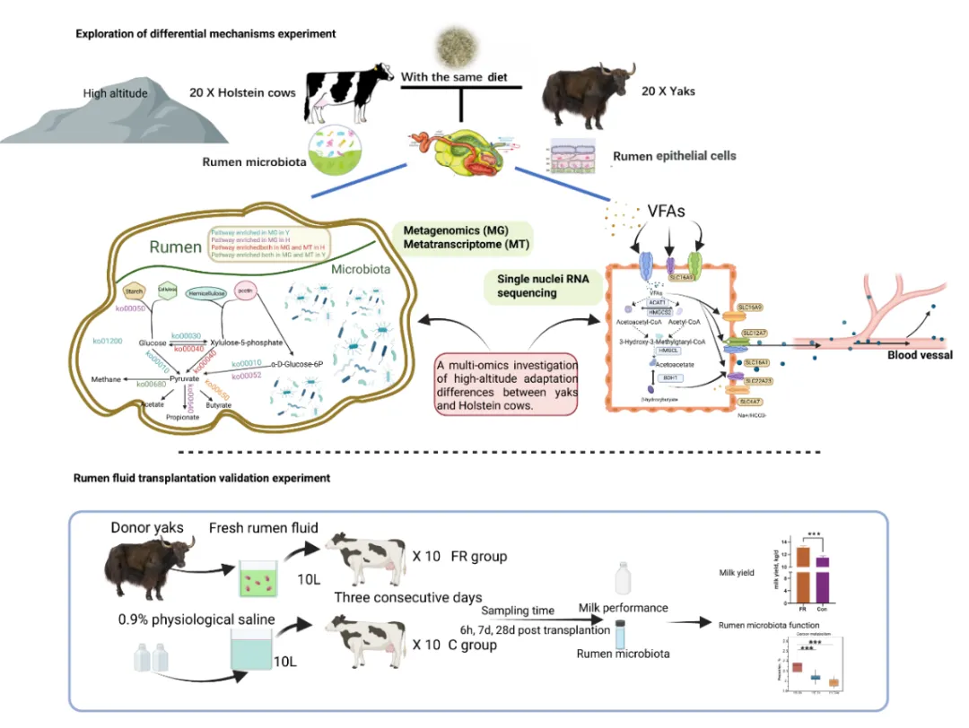 本研究选取自出生以来生长在高海拔的牦牛与荷斯坦牛为模型,应用多组学技术,包括瘤胃宏基因组学、宏转录组学和单核转录组学,对二者瘤胃生态系统进行了系统比较。研究发现,牦牛瘤胃微生物功能在碳代谢相关通路中显著富集,尤其是中心碳代谢相关通路包括糖酵解/糖异生、丙酮酸代谢和磷酸戊糖途径;荷斯坦牛具有更高的糖类特异性降解通路多样性,主要富集到淀粉和蔗糖代谢以及戊糖和葡萄糖醛酸相互转化通路。与荷斯坦奶牛相比,牦牛瘤胃上皮细胞表现出酮体代谢相关基因的表达上调和更高酮体合成和脂肪酸β氧化通路打分。研究人员引入牦牛瘤胃液移植技术并发现,在本试验条件下,移植后随时间推移瘤胃菌群中央碳代谢能力逐渐减弱,并在整个试验期内提高了荷斯坦牛的产奶量,进一步验证了瘤胃菌群调控宿主能量供应在牦牛适应高海拔环境方面的作用。