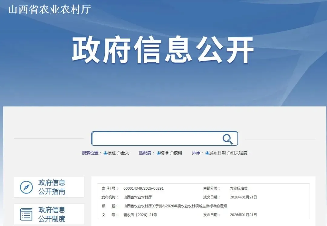 山西省农业农村厅关于发布2026年度农业农村领域主推标准的通知