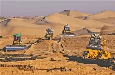 数十台推土机轰鸣作业,推筑阻沙堤、平整沙丘,本地农户忙着收割加工芦苇、铺设草方格,冬季治沙工程高效推进。机械与人工协同发力,在荒漠中播撒绿色希望,为抵御风沙侵袭筑牢第一道防线。