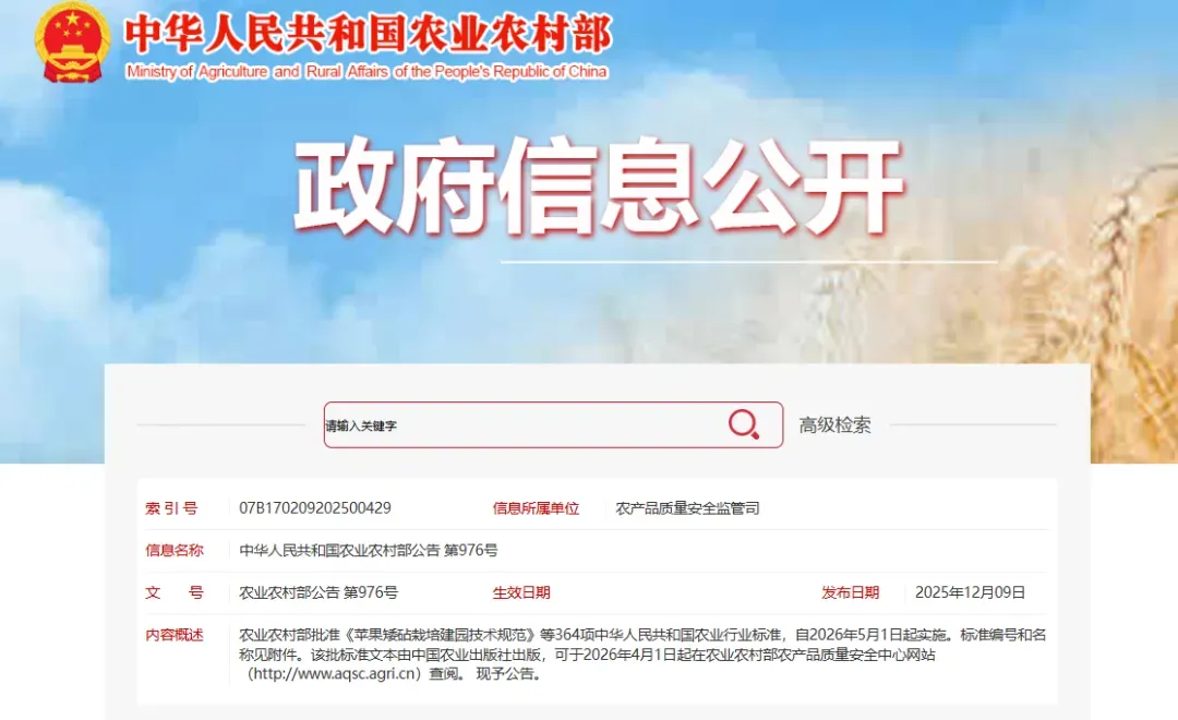 日前,农业农村部正式发布公告,批准《苹果矮砧栽培建园技术规范》等364项中华人民共和国农业行业标准,自2026年5月1日起实施。