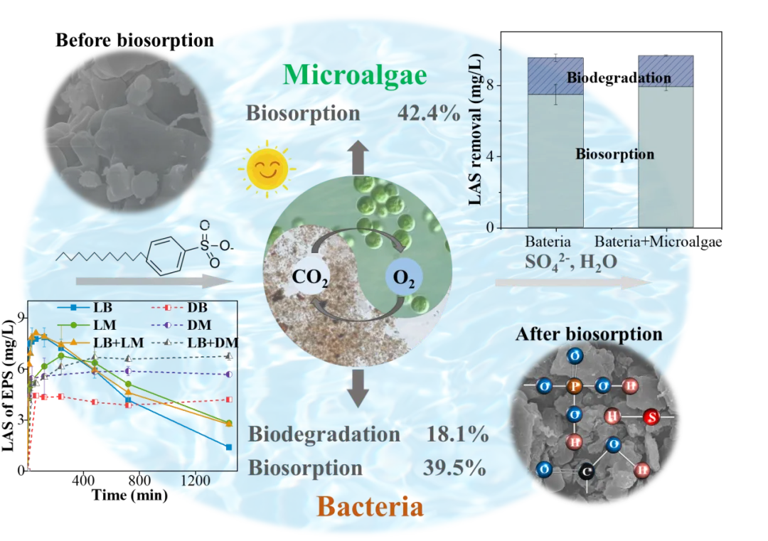 为了揭示上述问题,华中农业大学资源与环境学院周云教授团队通过在混合培养体系中通过选择性灭活混合培养液中微藻和细菌,确立了吸附和生物降解途径的定量区分。他们阐明了LAS的去除动力学,并明确了微藻和细菌在其中吸附和生物降解的具体贡献;通过对生物质形态和结构性质的全面表征,以及对官能基动力学基础的定量分析,揭示了微藻和细菌在灰水处理过程中LAS去除中独特定量贡献的机制。这些发现为微藻-细菌协同作用在难治污染物去除中的机制提供了新的见解,为优化微藻-细菌生物膜对灰水的处理奠定了坚实的理论基础。