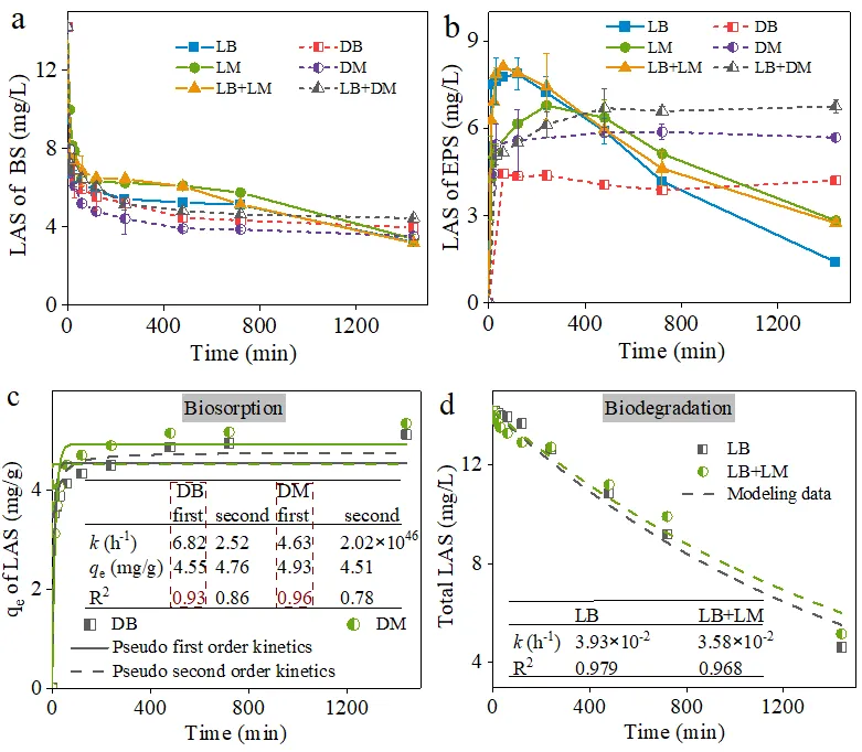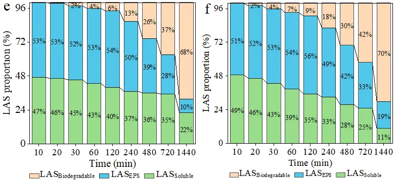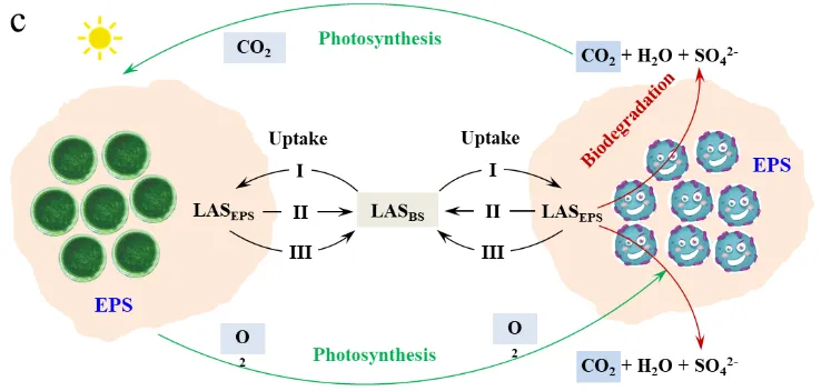 细菌和微藻由于其EPS中存在多种官能基,能够快速捕获LAS。细菌表现出比微藻更高的LAS结合亲和力,主导连续的LAS生物降解。值得注意的是,在活体和死亡微藻组中,EPS附着的LAS最初增加后保持稳定,表明微藻仅参与LAS生物吸附,而非LAS生物降解,这与LAS对微藻具有显著的生物毒性是一致的。