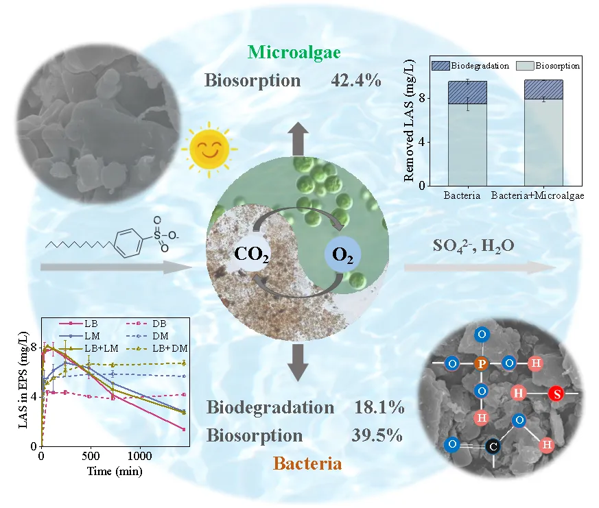 微藻与细菌的共生关系显著提高了有机污染物的去除效率,并同时丰富了微生物群落结构,这种互利关系进一步增强了系统对环境波动和有毒物质的抵抗力。直链烷基苯磺酸盐(LAS)是灰水中主要的阴离子表面活性剂,是生物处理系统中极具挑战性的污染物。LAS通过其疏水性和化学毒性对微藻造成细胞损伤,破坏细胞膜的完整性,抑制光合作用活动和生长,并降低持续的生物吸附能力。在高污染胁迫下,微藻-细菌共生生物膜通过分泌EPS,增加表面吸附或细菌介导的屏蔽来减弱LAS对微藻的毒性,并启动了对LAS生物毒性具有抵抗性的强大抗氧化防御机制。在这个系统中,微藻通过快速吸附启动沉淀过程,而细菌主要促进连续且高效的生物降解。然而,目前关于利用藻菌系统去除LAS的研究存在严重的知识空白。因此,量化和深入理解微藻和细菌在整体LAS矿化途径中的具体作用具有现实意义。