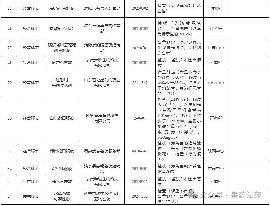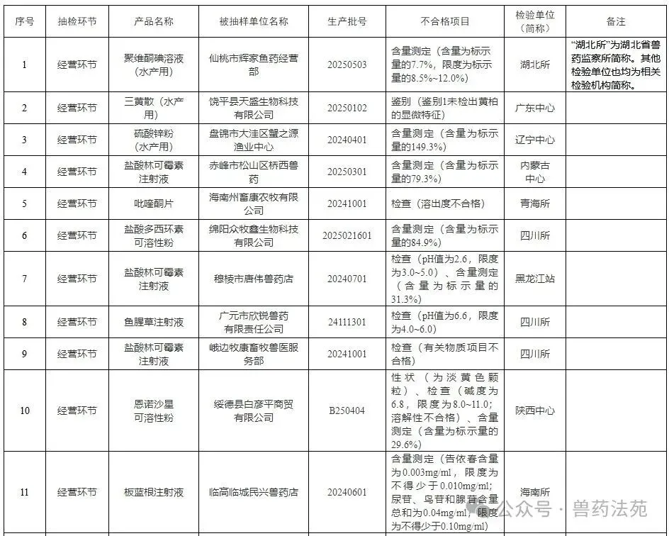 2025年第三季度省级监督抽检不合格非生物制品类兽药产品汇总表