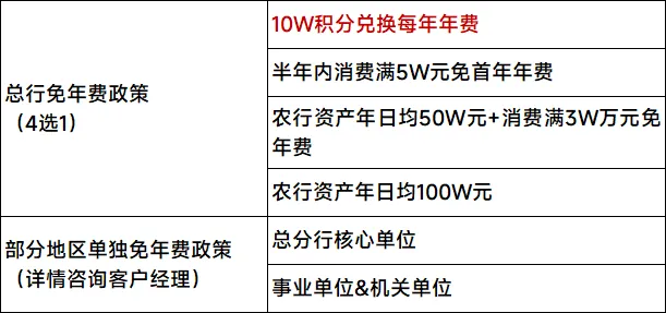 除了首年免年费的城市外,其他城市执行总行免年费政策,其中最简单的是10W积分抵扣每年年费。农行可领1倍快捷支付积分+购买5倍积分,线上消费共享6倍积分,消费1.67W元可得10万积分,抵扣年费很简单。总行新客开卡礼全国统一,激活后两个月内消费满5888元后,可以领取实物礼品+积分福利:除了总行新客开卡礼之外,各地分行还有不同力度的新客礼。