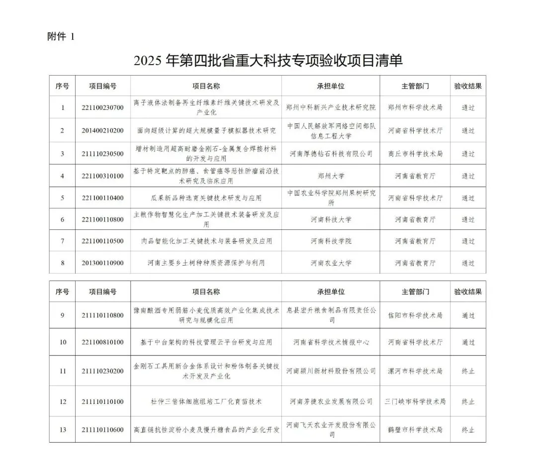 河南省科学技术厅 河南省财政厅 关于公布2025年第四批省重大创新项目验收结果的通知