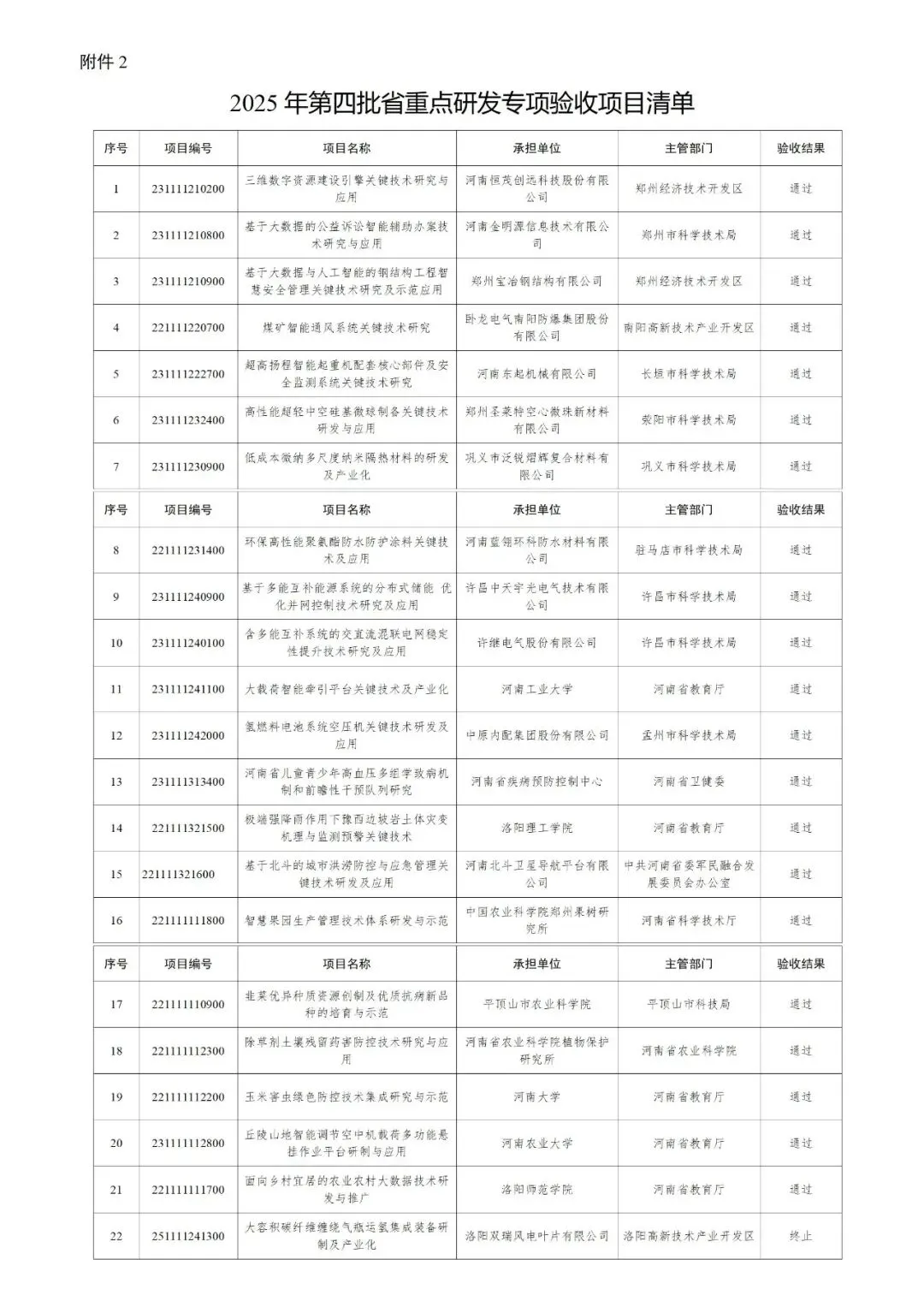 根据《河南省科技计划项目管理办法(试行)》(豫科〔2016〕83号)、《河南省重大科技专项管理办法(试行)》(豫科〔2019〕96号)、《河南省省级重大科技专项资金绩效管理办法》(豫财科〔2019〕91号)、《河南省省级创新研发专项资金管理办法》(豫财科〔2022〕46号),省科技厅、省财政厅组织专家对提出验收申请的省重大创新项目开展了项目验收和绩效评价工作,并对验收结果进行了公示。郑州中科新兴产业技术研究院等单位承担的31个项目通过验收,省财政将根据有关文件下达资金;另有4个项目予以终止。请各有关单位、主管部门进一步加强项目实施和经费支出管理,提高项目绩效。