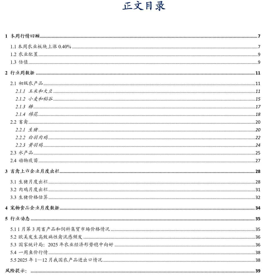 l 生猪价格反弹至13元/公斤,自繁自养连续两周盈利①生猪价格反弹至13元/公斤。本周六,全国生猪价格13元/公斤,周环比+0.7%。涌益咨询(1.16-1.22):全国90公斤内生猪出栏占比4.68%,周环比-0.19pct;50公斤二元母猪价格1559元/头,周环比持平,同比-5.0%;规模场15公斤仔猪出栏价456元/头,周环比+7.3%,同比-27.5%;②生猪出栏均重升至128.89公斤,大体重猪出栏占比降至6.54%。涌益咨询(1.16-1.22):全国出栏生猪均重128.89公斤,周环比+0.04公斤,较2024年、2025年同期分别+6.42公斤、+7.38公斤;150kg以上生猪出栏占比6.54%,周环比-0.17pct,较2024年、2025年同期+0.43pct、+1.74pct;175kg、200kg与标猪价差分别为0.64元/斤、0.96元/斤;③生猪自繁自养连续两周盈利。伴随着猪肉销售进入消费旺季,猪价自2025年12月开始反弹,本周生猪自繁自养盈利43.35元/头,自2025年9月中旬以来连续两周盈利。2025年12月末,能繁母猪存栏量3961万头;目前,生猪出栏均重仍显著高于2024、2025年同期水平,我们判断,春节后猪价将迎来新一波下跌,生猪行业有望再次去产能;④估值处历史低位,继续推荐生猪养殖板块。据2025年生猪预测出栏量,牧原股份头均市值2,792元、温氏股份1,831元、新希望2,370元、德康农牧2,275元、天康生物2,743元、立华股份664元、天邦916元、正邦4,429元、巨星2,225元、神农4,418元、京基4,372元、东瑞2,533元,猪企估值多处于历史低位,我们继续推荐生猪养殖板块,重点推荐牧原股份、天康生物、温氏股份、立华股份。l 2025年白羽祖代更新量157.42万套,黄羽鸡价格周环比上涨①2025年白羽祖代更新量157.42万套。本周五,鸡产品价格9,250元/吨,周环比+1.1%,同比-0.5%;肉鸡苗价格2.2元/羽,周环比-19.7%,同比-12.4%。白羽肉鸡协会公布2025年12月报:2025年全国祖代更新量157.42万套,同比+4.9%,其中,进口占比45%,自繁占比55%,祖代更新数量仍处于历史高位;2019-2025年,父母代鸡苗销量连续七年增加,2025年父母代鸡苗销量8190.47万套,同比+8.9%,12月父母代鸡苗销量888.17万套,同比+30.2%;2025年,父母代价格44.75元/套,其中,12月父母代价格43.8元/套,同比-14.1%;②黄羽鸡价格周环比上涨。1月23日,三黄鸡均价16.03元/公斤,周环比+2.6%,同比-2.8%;1月22日,青脚麻鸡均价6.1元/斤,周环比+1.7%,同比+41.9%。l 2025年中国城镇宠物(犬猫)市场规模+4.1%,Q4核心品牌维持高增2026年中国宠物行业白皮书发布:①2025年中国城镇宠物(犬猫)市场规模达到3126亿元,同比+4.1%。其中,犬、猫消费市场规模分别为1606亿元、1520亿元,同比分别+3.2%、+5.2%;预计2028年城镇宠物(犬猫)消费市场规模达到4050亿元,其中,犬、猫消费市场规模分别达到1923亿元、2184亿元;②2025年城镇犬猫数量12,632万只,同比+1.8%,其中,宠物犬数量5,343万只,同比+1.6%,宠物猫数量7,289万只,同比+1.9%,宠物猫数量增幅继续放缓;③90后宠主仍是养宠主力军,占比42.7%,00后、80后宠主占比分别为26.3%、24.5%,随着00后宠主迅速增长,80前宠主占比仅6.5%;④食品仍是宠主的主要消费市场,市场份额53.7%,我们推算2025年中国宠物(犬猫)食品市场规模约1679亿元,同比+5.9%。宠物食品品类逐渐趋向分散化、多元化发展,烘焙粮、冻干粮、湿粮、鲜粮均有所上升,功能性食品受到宠主关注,增强免疫、肠胃健康等功能性标签最受宠主关注。2025Q4,核心宠物食品品牌收入维持高增长。2025Q1-Q4,猫狗食品三平台(天猫、京东、抖音)销售额同比+18.5%、+9.5%、+5.5%、+8.8%。2025Q4麦富迪、弗列加特、顽皮、领先、爵宴销售额同比+13.3%、+51.5%、+57.1%、+84.0%、+33.5%;2025Q4皇家、蓝氏、鲜朗、渴望销售额同比+38.2%、+16.4%、+73.3%、+22.2%。l 我国牛存栏已累计下降8.6%,1H2026牛价有望加速上行①截至2025年末,我国牛存栏已累计下降8.6%。2023年牛肉价格开启了二十年以来的第一轮大跌,2023-2025年,我国能繁母牛持续去化,2025年末我国牛存栏已降至9,608万头,环比-3.3%,较2023年末累计下降8.6%,我们推算2026年牛存栏将持续下行;②牛存栏下降是牛价大涨的先行指标。i)2006-2008年,牛期末存栏累计下降8%,2007年1月-2008年12月牛价大涨67%;ii)2010-2013年,牛期末存栏同比累计下降9%,2012年1月-2013年12月牛价大涨44%;③1H2026牛价有望开始加速上行。牛属于单胎动物,且养殖周期漫长,从能繁母牛怀孕到育成牛出栏需要约28个月,我们预计今年上半年我国肉牛价格将开始加速上行,伴随着牛肉进口政策落地,本轮牛价上涨有望持续至2028年,建议继续关注牛产业链。1 本周行情回顾
