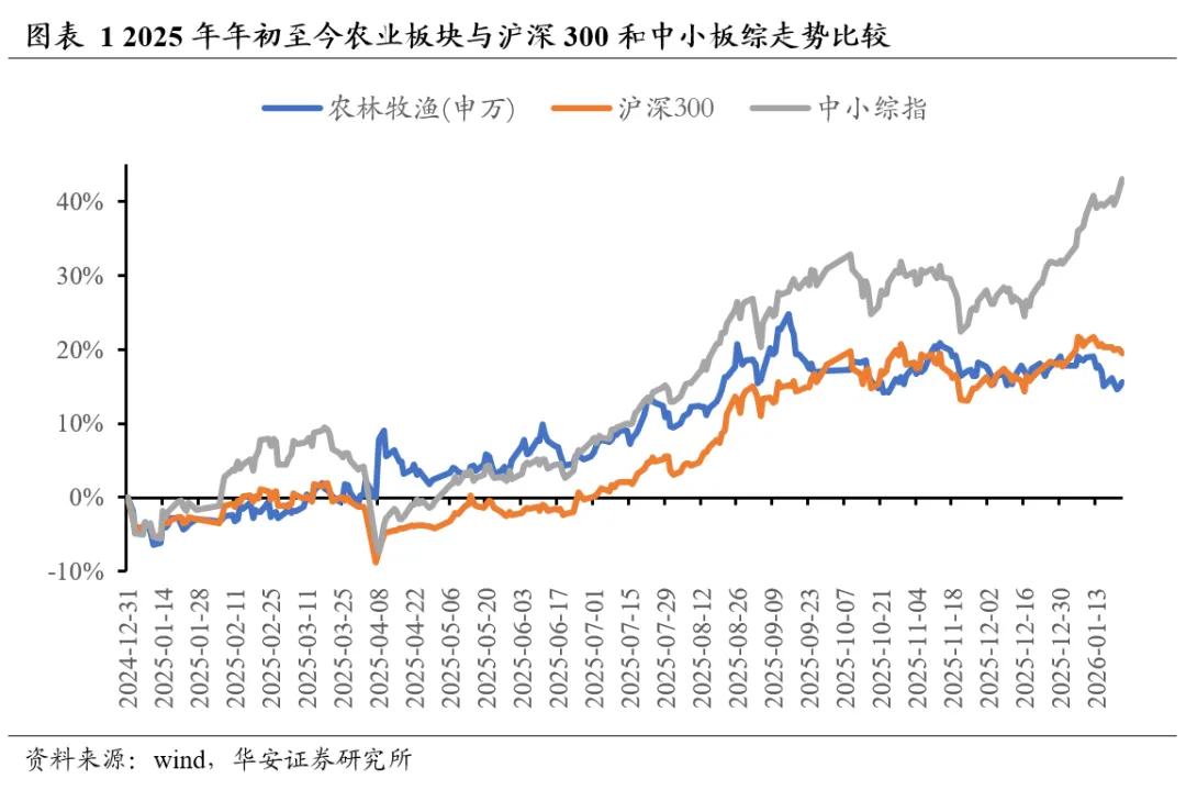 本周(2026年1月19日-2026年1月23日)农林牧渔(申万)指数上涨0.40%,沪深300指数下跌0.62%,中小板综指数上涨2.60%,农业指数跑赢沪深300指数1.02个百分点。