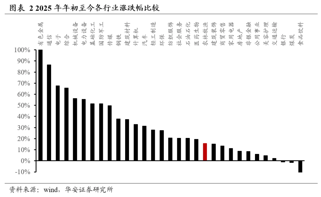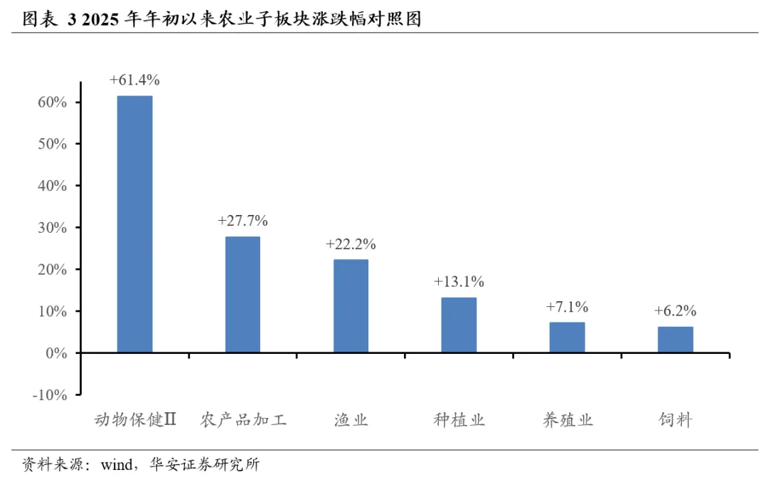 2025年初至今,农业各子板块涨幅从高到低依次为动物保健Ⅱ(+61.4%)、农产品加工(+27.7%)、渔业(+22.2%)、种植业(+13.1%)、养殖业(+7.1%)、饲料(+6.2%)。