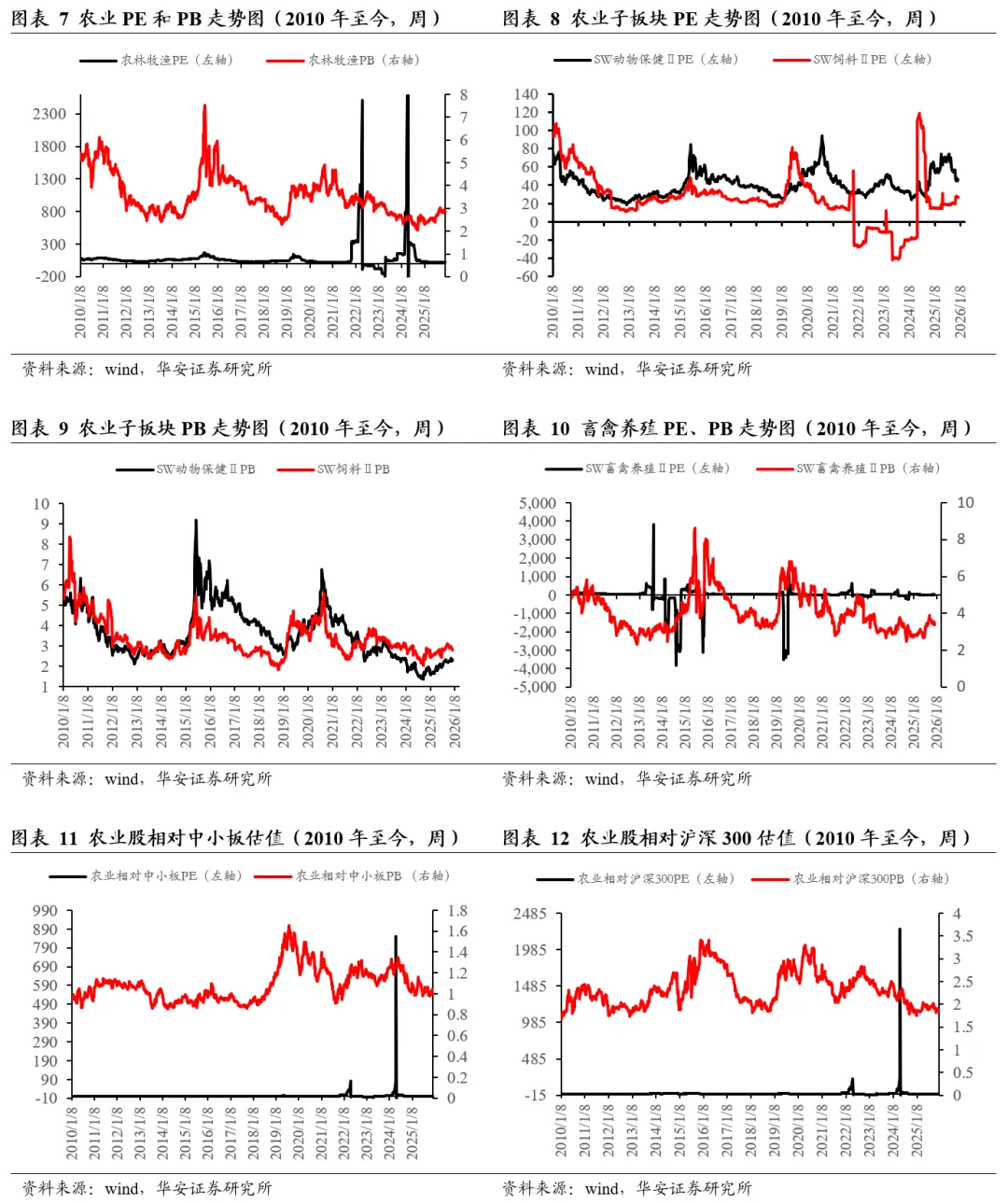 2026年1月23日,农业板块绝对PE和绝对PB分别为25.34倍和2.67倍,2010年至今农业板块绝对PE和绝对PB的历史均值分别为109.20倍和3.55倍;农业板块相对中小板PE和PB分别为0.54倍和0.86倍,历史均值分别为3.08倍和1.09倍;农业板块相对沪深300 PE和PB分别为1.80和1.83倍,历史均值分别为9.22倍和2.34倍。
