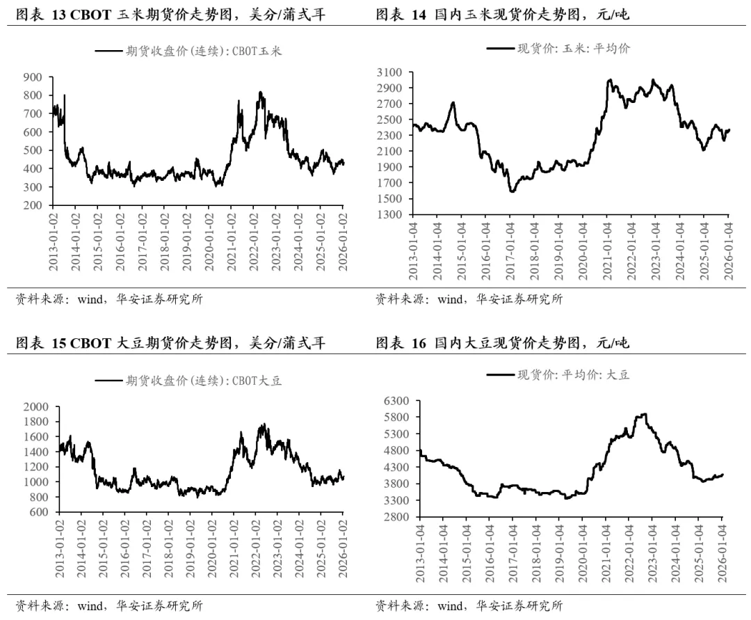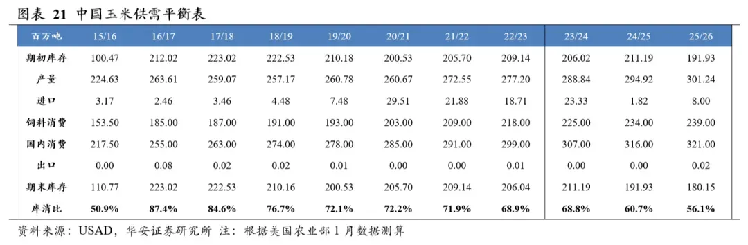 分国别看,2025/26年度美国玉米产量4.32亿吨,国内消费量3.35亿吨,期末库存5,656万吨,库消比13.6%,较24/25年度上升3.35个百分点;2025/26年度中国玉米产量3.01亿吨,国内消费量3.21亿吨,期末库存1.80亿吨,库消比56.1%,较24/25年度下降4.62个百分点。