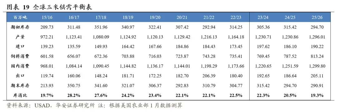 美国农业部2026年1月供需报告预测,2025/26年度(12月至次年11月)全球玉米产量12.96亿吨,国内消费量13.0亿吨,期末库存2.91亿吨,库消比19.3%,预测值较24/25年度下降1.16个百分点。