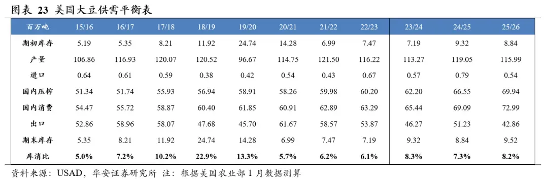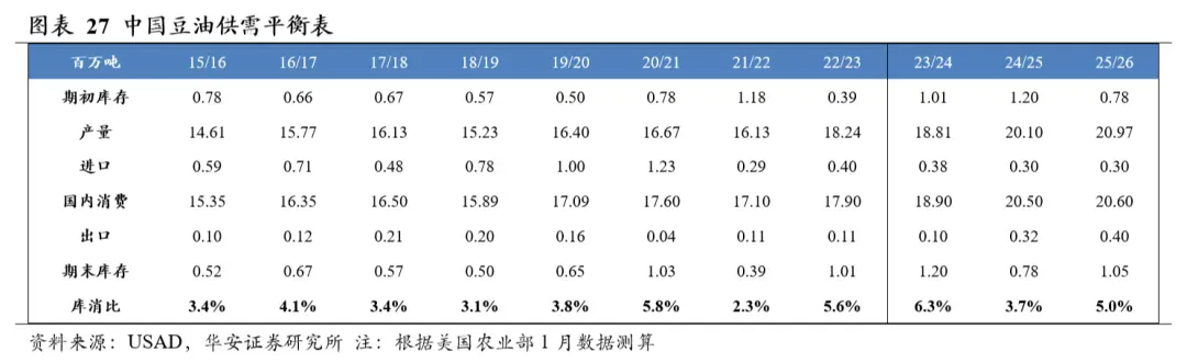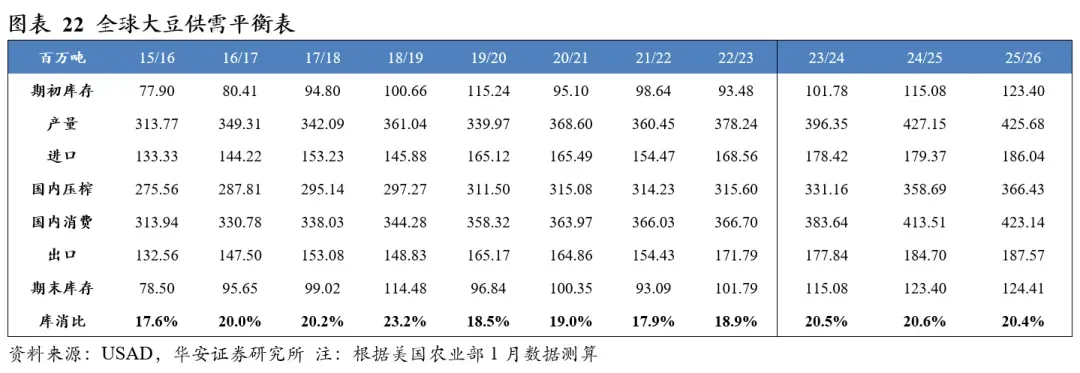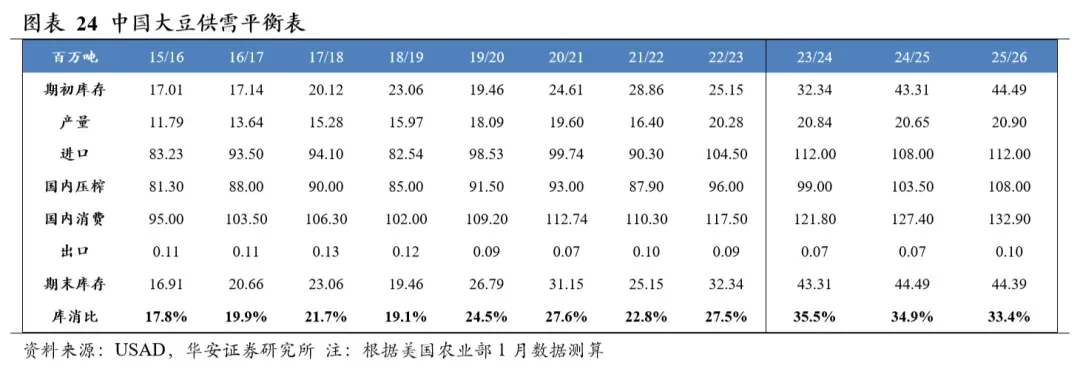 分国别看,2025/26年度美国大豆产量1.16亿吨,国内消费量7,299万吨,期末库存952万吨,库消比8.2%,较24/25年度上升0.87个百分点;2025/26年度中国大豆产量2,090万吨,国内消费量1.33亿吨,期末库存4,439万吨,库消比33.4%,较24/25年度下降1.53个百分点。