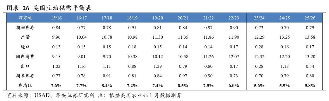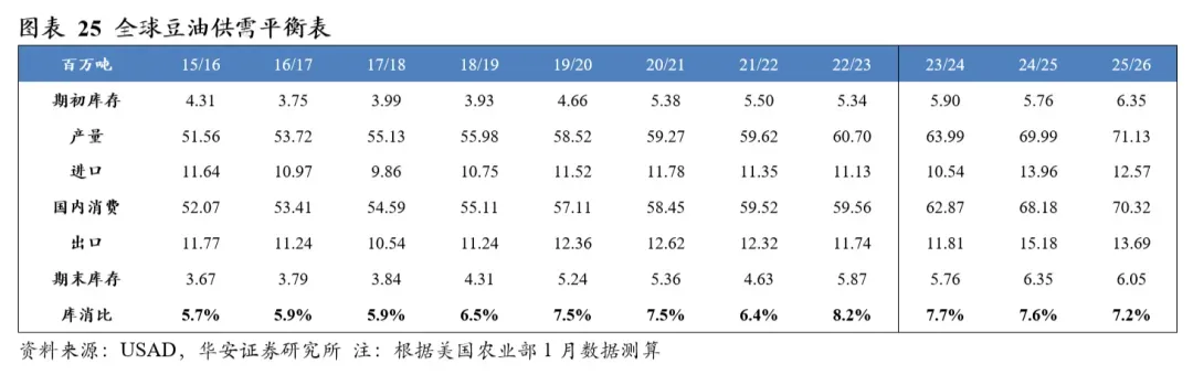 美国农业部2026年1月供需报告预测,2025/26年度全球豆油产量7,113万吨,国内消费量7,032万吨,期末库存605万吨,库消比7.2%,较24/25年度下降0.42个百分点。