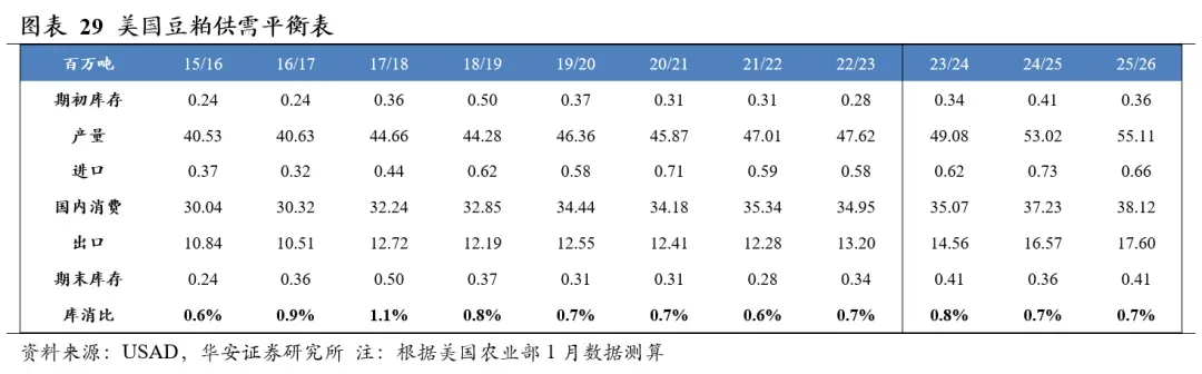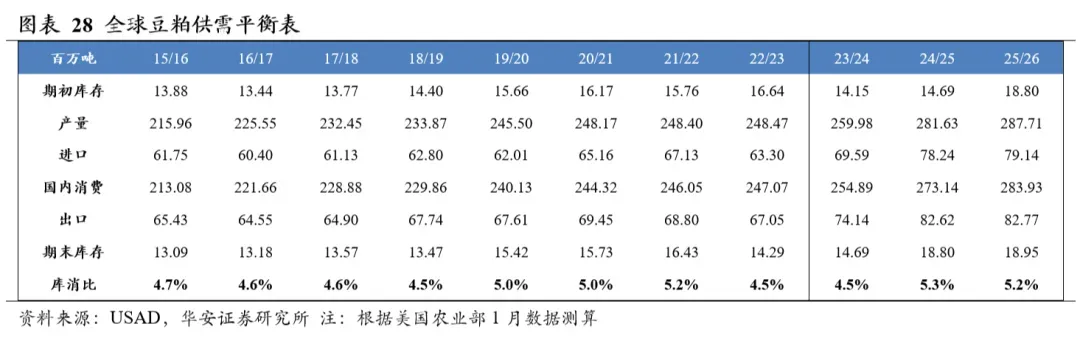 美国农业部2026年1月供需报告预测,2025/26年度全球豆粕产量2.88亿吨,国内消费量2.84亿吨,期末库存1,895万吨,库消比5.2%,较24/25年度下降0.12个百分点。2025/26年度美国豆粕产量5,511万吨,国内消费量3,812万吨,期末库存41万吨,库消比0.7%,较24/25年度上升0.07个百分点。