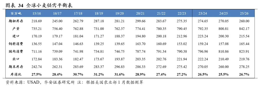 美国农业部2026年1月供需报告预测,2025/26年度全球小麦产量8.42亿吨,国内消费量8.24亿吨,期末库存2.78亿吨,库消比26.7%,较24/25年度上升1.20个百分点。