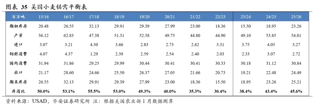 分国别看,2025/26年度美国小麦产量5,401万吨,国内消费量3,084万吨,期末库存2,521万吨,库消比45.6%,较24/25年度上升2.17个百分点;2025/26年度中国小麦产量1.40亿吨,国内消费量1.48亿吨,期末库存1.25亿吨,库消比83.8%,较24/25年度下跌0.82个百分点。