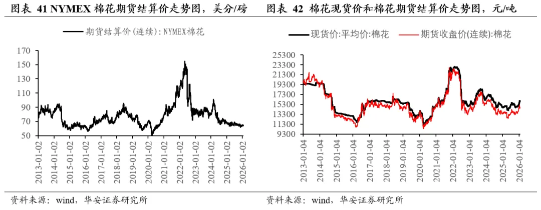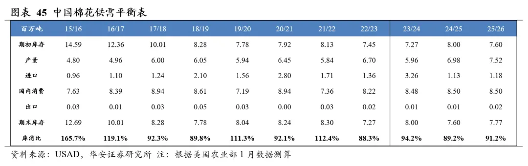 分国别看,2025/26年度美国棉花产量303万吨,国内消费量35万吨,期末库存92万吨,库消比30.4%,较24/25年度上升1.02个百分点;2025/26年度中国棉花产量752万吨,国内消费量850万吨,期末库存777万吨,库消比91.2%,较24/25年度上升2.05个百分点。