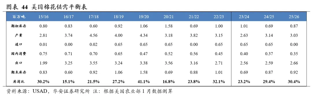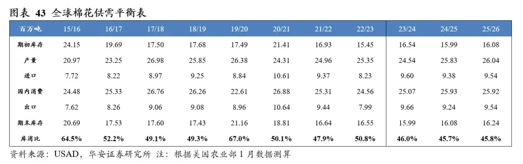 美国农业部2026年1月供需报告预测,2025/26年度全球棉花产量2,604万吨,国内消费量2,592万吨,期末库存1,624万吨,库消比45.8%,较24/25年度上升0.06个百分点。