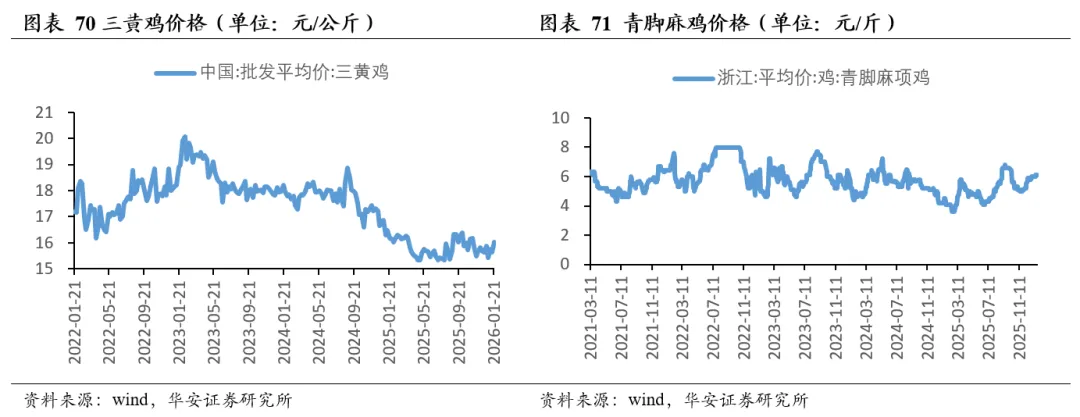 2026年1月23日,三黄鸡均价16.03元/公斤,周环比涨2.56%,同比跌2.79%;2026年1月22日,青脚麻鸡均价6.10元/斤,周环比涨1.67%,同比涨41.86%。
