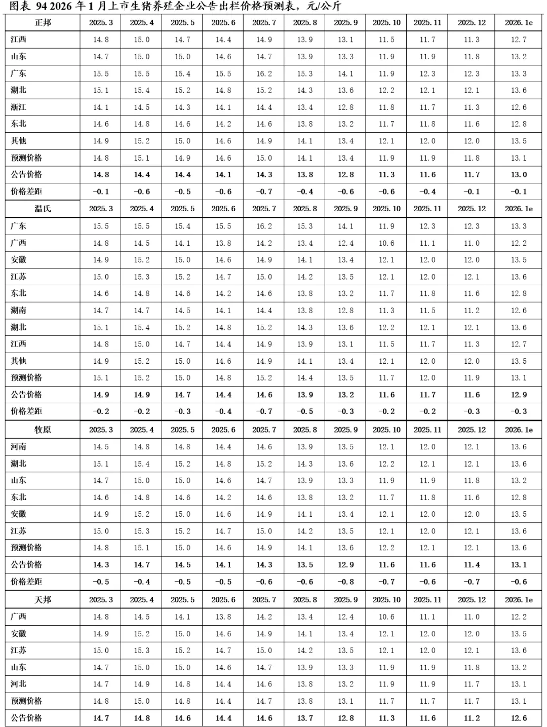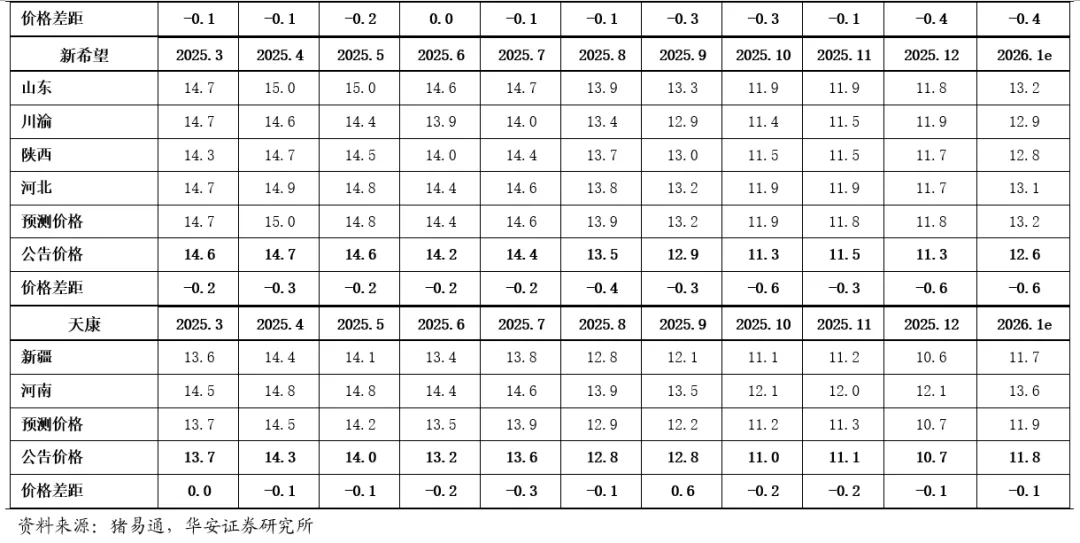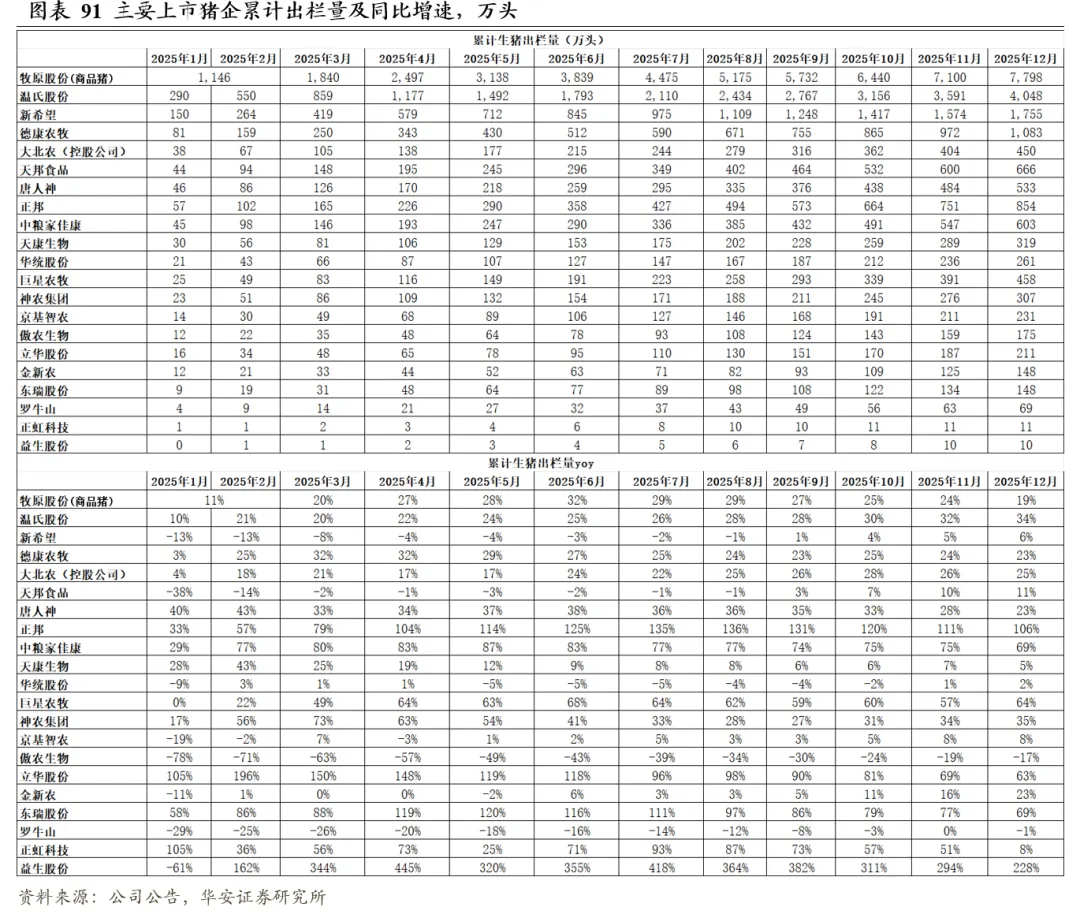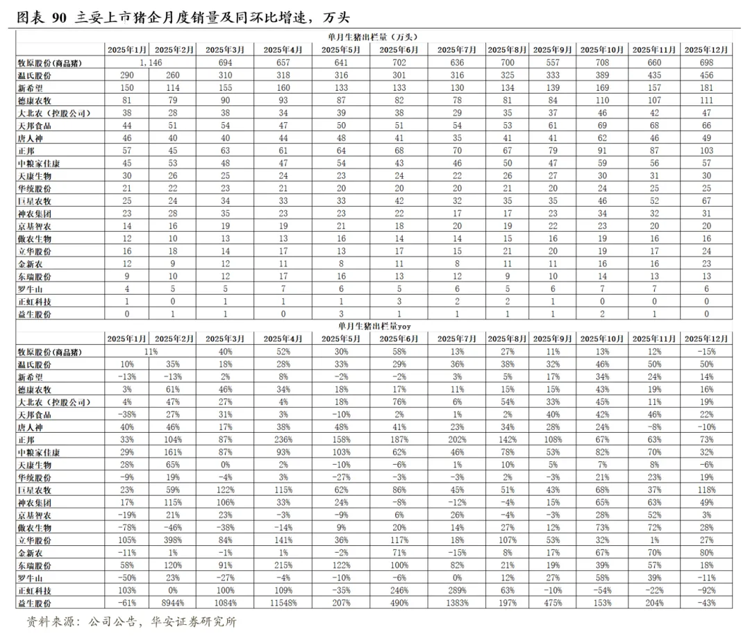 2025年12月,19家上市猪企出栏量1,998万头,同比+11.2%,出栏量(万头)从高到低依次为,牧原股份698(仅商品猪出栏量)、温氏456、新希望181、德康农牧111、正邦103、巨星农牧67、天邦食品66、中粮家佳康57、唐人神49、大北农(控股公司)47、神农集团31、天康生物30、华统股份25、立华股份24、金新农23、京基智农20、傲农生物16、东瑞13、罗牛山6、正虹科技0;出栏量同比增速从高到低依次为,巨星农牧118%、金新农80%、正邦73%、温氏50%、神农集团49%、中粮家佳康32%、傲农生物28%、立华股份27%、天邦食品22%、大北农(控股公司)19%、华统股份19%、东瑞18%、德康农牧16%、新希望14%、京基智农3%、天康生物-6%、唐人神-10%、罗牛山-11%、牧原股份-15%、正虹科技-92%。