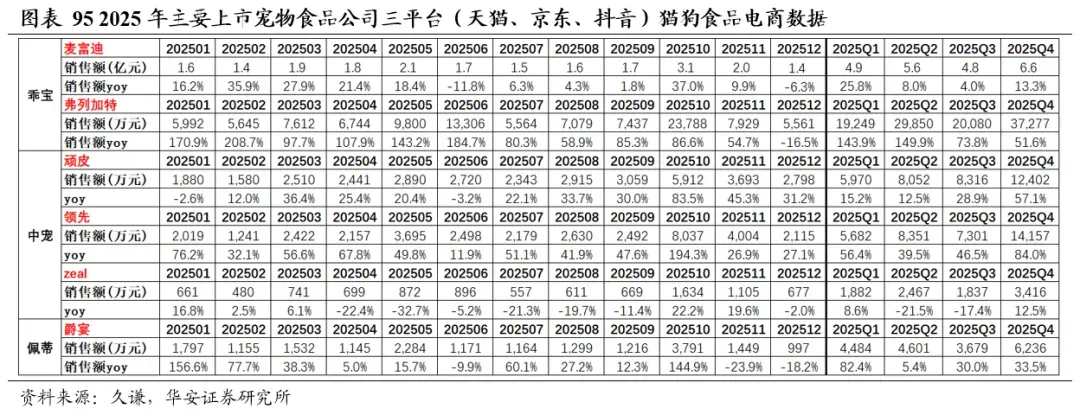 2025Q1-Q4,猫狗食品三平台(天猫、京东、抖音)销售额同比+18.5%、+9.5%、+5.5%、8.8%;2025年12月,猫狗食品三平台(天猫、京东、抖音)销售额同比-11.3%。