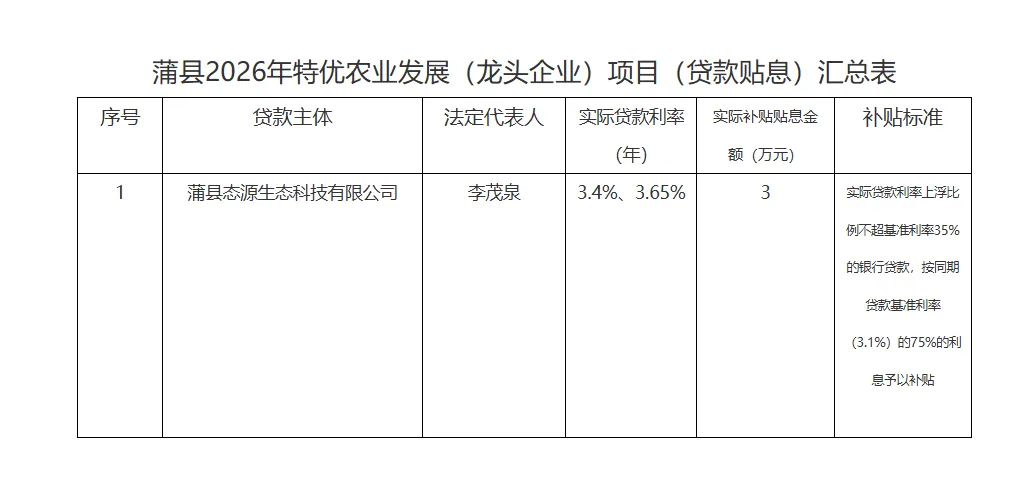 为全面贯彻落实《山西省人民政府办公厅关于扶持农业产业化企业发展若干政策的通知》(晋政办发〔2019〕69号)、山西省农业农村厅《关于印发2026年支持龙头企业发展及农产品精深加工企业设备购置补助项目使用工作指引的通知》(晋农涵〔2026〕17号)等文件精神,经过资料审核,初步决定对蒲县态源生态科技有限公司2025年1月1日至9月30日贷款进行贴息,现予以公示,公示日期2026年1月 23日至2026年1月31日,公示期间如有异议,请及时向蒲县农业农村和水利局反映。