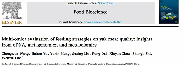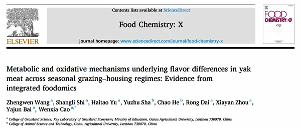 近日,甘肃农业大学草业学院师生在牦牛肉品质与风味形成机制研究方面取得重要进展。研究团队围绕牦牛在不同饲养制度下“草地资源供给—选择性采食—营养沉积—肉品质与风味”这一完整链条,开展了系统而深入的探索,相关成果已分别发表于国际权威期刊《Food Chemistry: X》(中科院1区Top,影响因子8.2)和《Food Bioscience》(中科院2区Top,影响因子5.9)。两篇论文的第一作者均为甘肃农业大学草业学院博士研究生王正文,通讯作者为曹文侠教授,师尚礼教授则在项目支撑与试验设计等方面提供了关键支持。