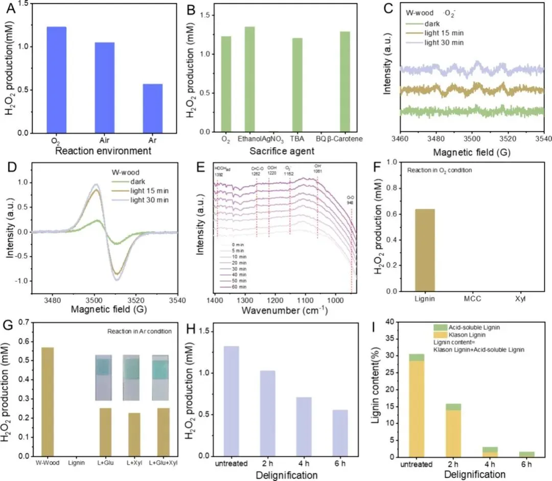 图2 | W-wood的光催化机制。(A)W-wood在不同气体环境中催化产生H2O2的情况。(B)在添加不同牺牲剂的情况下,W-wood催化产生H2O2的情况。(C)W-wood在光照和黑暗条件下产生的·O2−的电子自旋共振(ESR)图谱。(D)W-wood在光照和黑暗条件下的ESR谱图。(E)W-wood光催化水反应的原位傅里叶变换红外光谱测试。(F)在氧气条件下,木质素(L)、微晶纤维素(MCC)和 D-木糖(Xyl)的光催化H2O2生成率的比较。(G)在氩气条件下,W-wood粉末、L与D-葡萄糖(Glu)和D-木糖(Xyl)系统的光催化过氧化氢生成率的比较。(H)在模拟太阳辐射(100 毫瓦/平方厘米)作用下,不同程度脱木素处理后的W-wood的光热催化H2O2生成情况。(I)不同程度脱木素处理后的W-wood中的木质素含量。