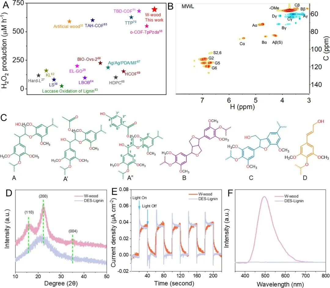 图3 | W-wood的光热催化机制。(A)W-wood与已报道的木质素基及其它光催化剂的活性对比。(B)MWL的二维HSQC核磁共振谱。(C)木质素的主要结构和化学键。(D)W-wood及其从其中提取的DES-木质素的XRD图谱。(E)W-wood及其从其中提取的DES-木质素的光电流。(F)W-wood及其从其中提取的DES-木质素的室温磷光光谱。