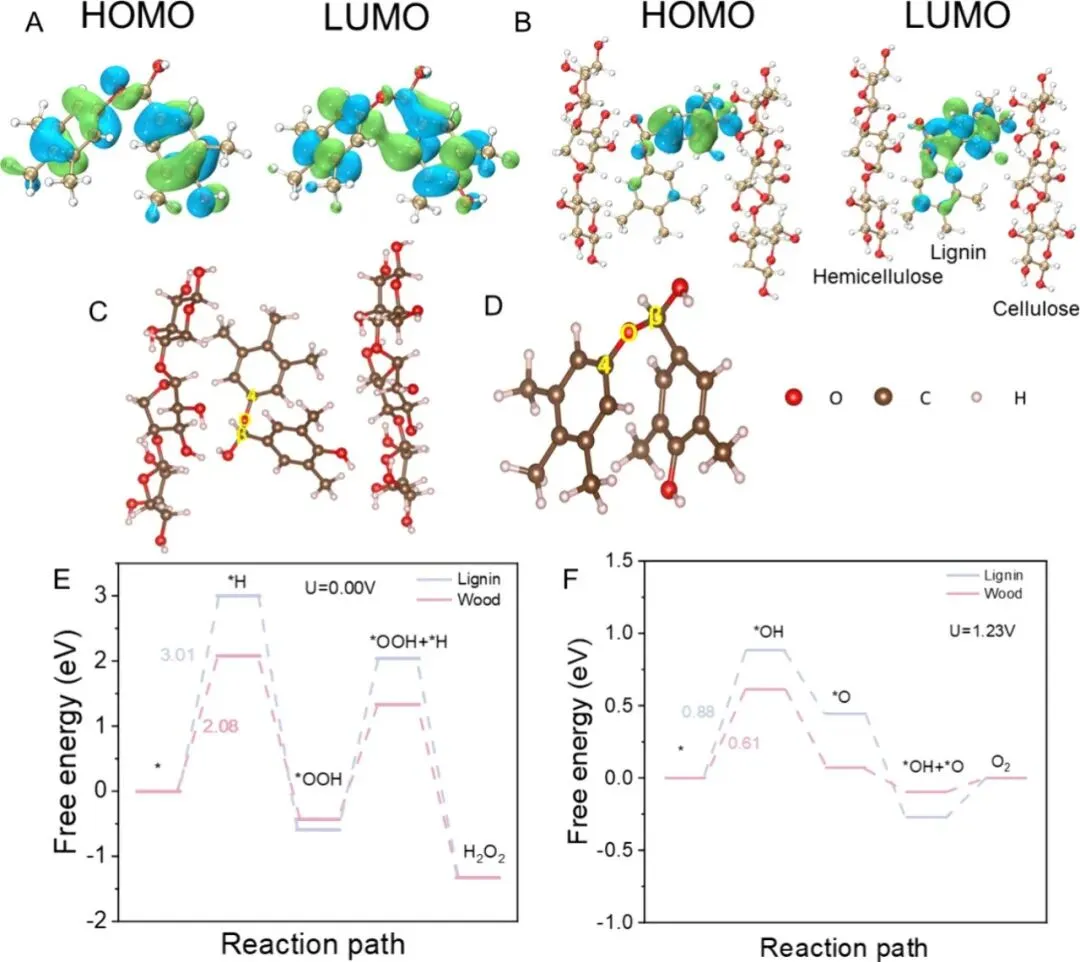 图4 | 木材和木质素的密度泛函理论计算。(A)孤立木质素的最高占据分子轨道(HOMO)和最低未占据分子轨道(LUMO)能级。(B)天然木材中木质素的HOMO和LUMO能级。(C)天然木材中木质素的电荷分布图。(D)孤立木质素的电荷分布图。(E)木质素和木材上2 e-还原氧化反应(ORR)的比较反应曲线。(F)木质素和木材上4 e-氧化反应(WOR)的比较反应曲线。还指出了4 e-WOR和2 e-ORR在木质素和木材上的反应自由能(RDS)值。
