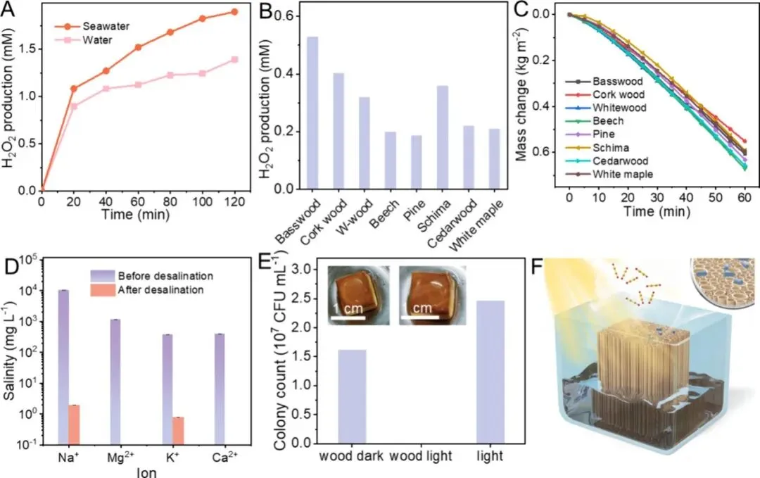 图5 | 应用项目:(A)在纯水和海水中,通过模拟太阳辐射(100 mW cm-1)对白木进行光热催化制H2O2反应。(B)在5小时内,不同木材从海水中制取脱盐的H2O2。(C)不同木材在模拟太阳辐射(100 mW cm-1)作用下海水的质量变化随时间的变化情况。(D)通过白木脱盐前后的四种主要离子(Na+、Mg2+、K+和Ca2+)的浓度。(E)在不同环境中培养的大肠杆菌菌落计数。(F)用白木制成的小型灭菌和消毒装置的示意图。