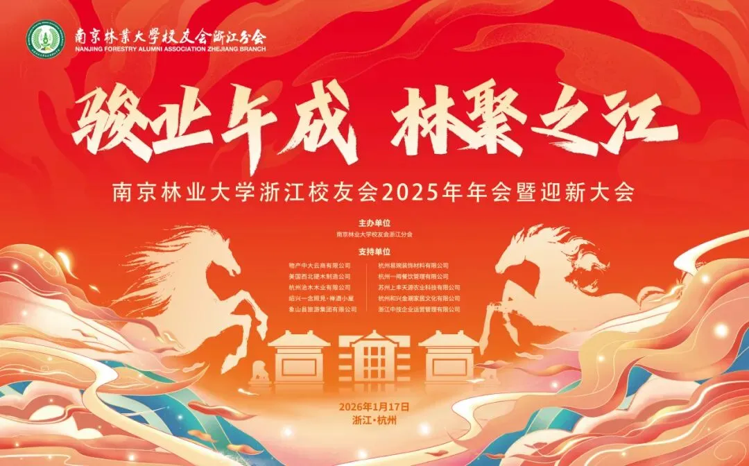 2026年1月17日下午,南京林业大学浙江校友会2025年年会暨迎新大会在杭州隆重举行,一百二十余名校友从四方归来,会同四十余名母校领导及特邀嘉宾齐聚一堂,共赴一场以“骏业午成,林聚之江”为主题的年度盛会。