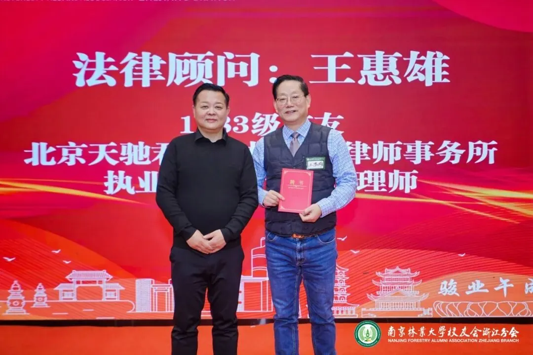 会长吉祥为校友会法律顾问王惠雄校友(北京天驰君泰杭州律师事务所执业律师、专利代理师)颁发聘书,为校友会发展及校友工作、生活提供专业免费的法务咨询支持。