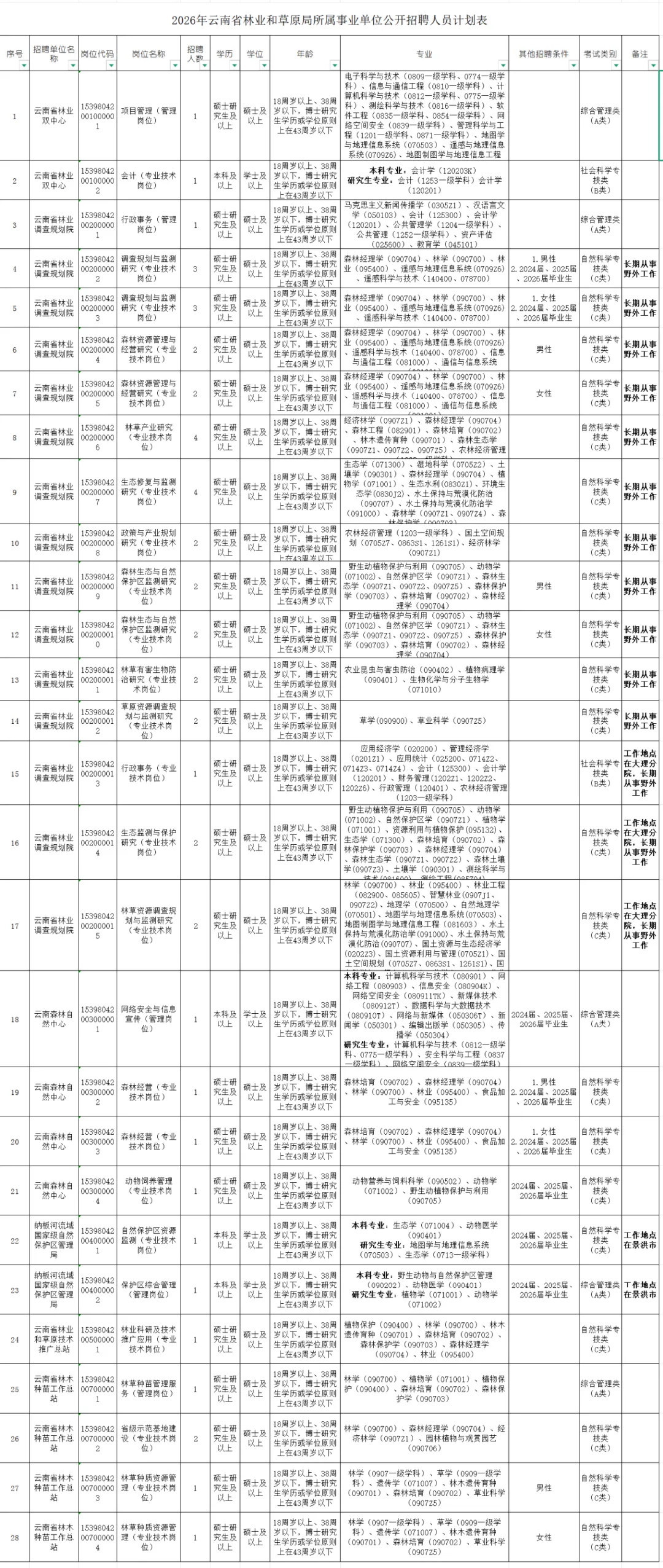 符合本公告相关岗位条件要求的人员均可报名。具体招聘范围和条件,详见《2026年云南省林业和草原局所属事业单位公开招聘人员计划表》。报名人员年龄在18周岁以上、38周岁以下,博士研究生学历或学位原则上在43周岁以下。年龄计算截止日期2026年2月1日。