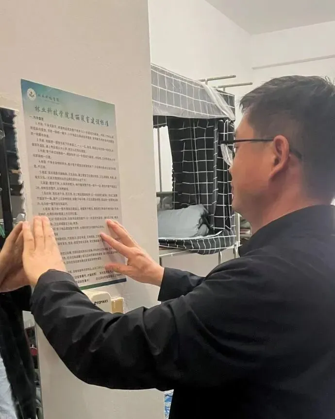 同时,学院还组织了班主任下寝室宣传指导美丽寝室建设要求,并向各班级寝室发放《林业科技学院美丽寝室建设标准》海报,该标准不仅涵盖寝室内务整理方面的细则,还囊括了寝室文化建设以及在校突发状况的应急处理方法、重要的电话号码等,为同学们在寝室建设方面提供了具有指导性意见。