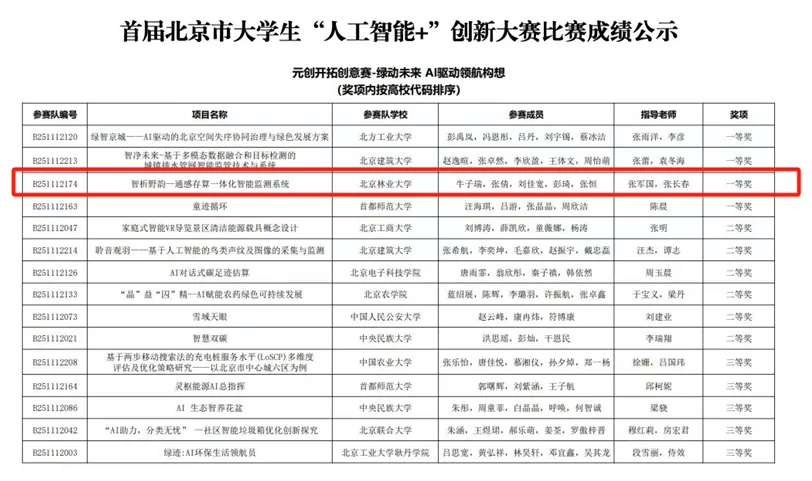 从实验室的算法推演,到野外环境的实地部署,感知林业先锋团队用汗水诠释了“知山知水,树木树人”的校训精神。此次斩获一等奖,不仅是对团队技术创新能力的肯定,更是北林在“人工智能+林业”交叉学科建设、跨学科解决复杂问题能力培养方面的阶段性成果展示。未来,团队将继续优化算法,推动成果在更多自然保护区落地。