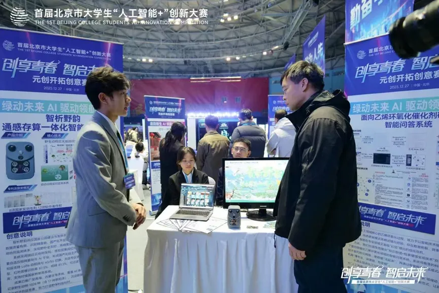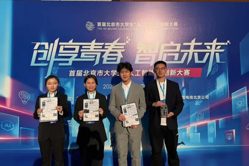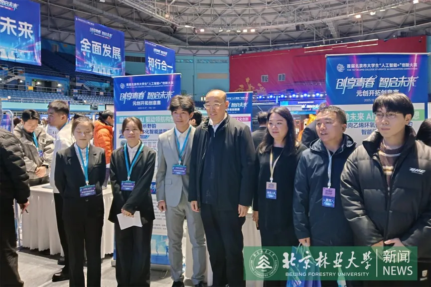 2025年12月27日,“创享青春、智启未来”首届北京市大学生“人工智能+”创新大赛在北京工业大学奥运场馆举办。感知林业先锋团队学子凭借《智析野韵—通感存算一体化智能监测系统》项目,从55所高校的222支决赛队伍中脱颖而出,荣获市级决赛一等奖。本次获奖团队由工学院牵头组建,为多学科交叉融合的本科生创新团队,团队成员包括牛子瑞、张倩、刘佳宽、彭琦、张恒五名本科生,在张军国教授和张长春副教授的指导下开展研究与实践。