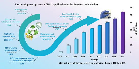 随着“碳中和”目标的提出和电子废弃物环境压力的日益严峻,开发可持续、可降解的生物基材料已成为柔性电子领域的迫切需求。生物基聚氨酯(BPU)因其可调的分子结构和优异的机械性能,被视为替代传统石油基弹性体的理想候选者。然而,如何兼顾其在柔性电子器件中所需的高导电性、力学稳定性与环境耐受性,仍是限制其大规模应用的核心瓶颈。