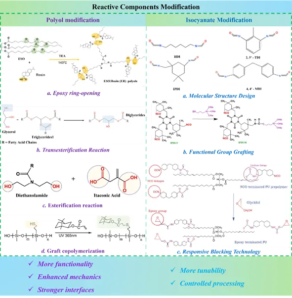 图3 生物基聚氨酯分子结构中反应性组分改性策略示意图。